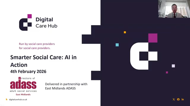East Midlands ADASS, working in partnership with the Digital Care Hub, held a webinar on 4th February 2026 for care providers, that introduced what AI is, common myths and explored how it can support, quality, efficiency and outcomes in care services.